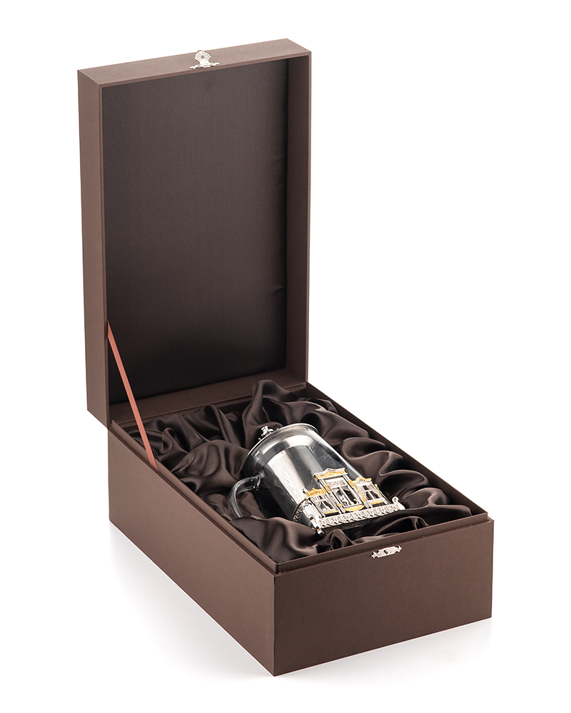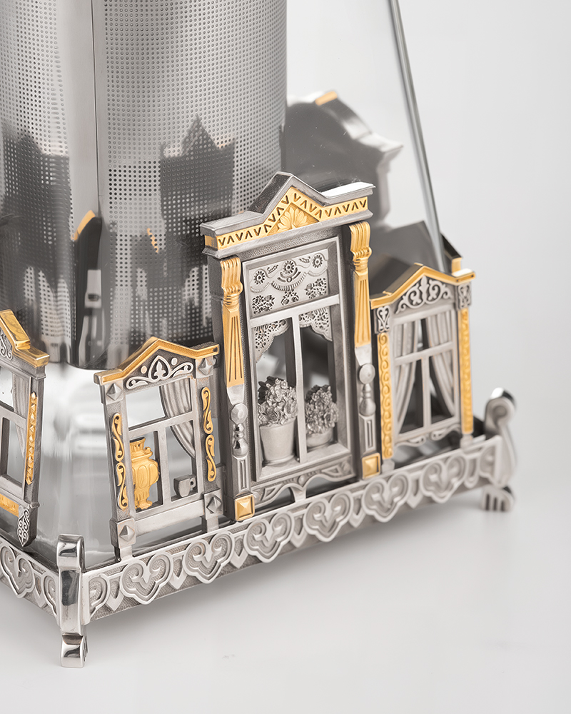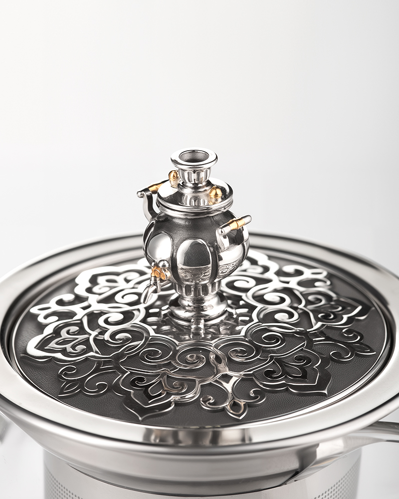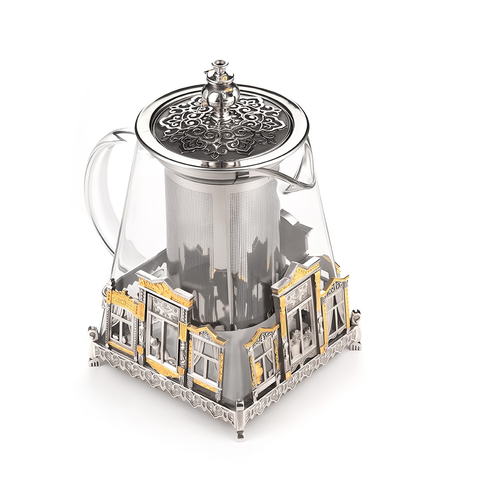 Заварочный чайник посвящен красоте и разнообразию русских деревянных оконных наличников. Сосуд изготовлен из боросиликатного стекла, что кроме термостойкости придает ему особый блеск и устойчивость к царапинам. Ручка термически изолирована. Съемный фильтр легко промывается.