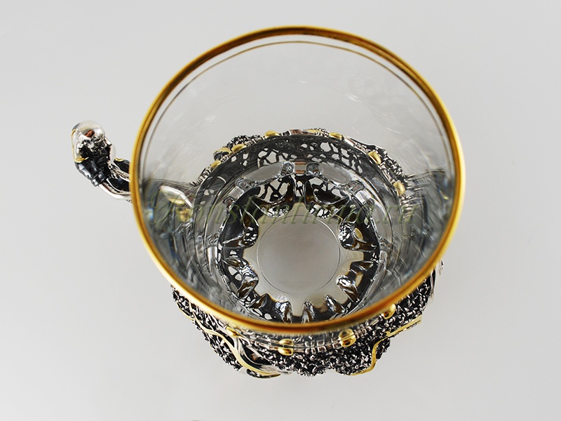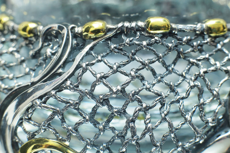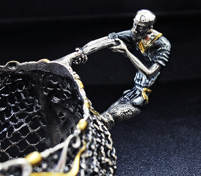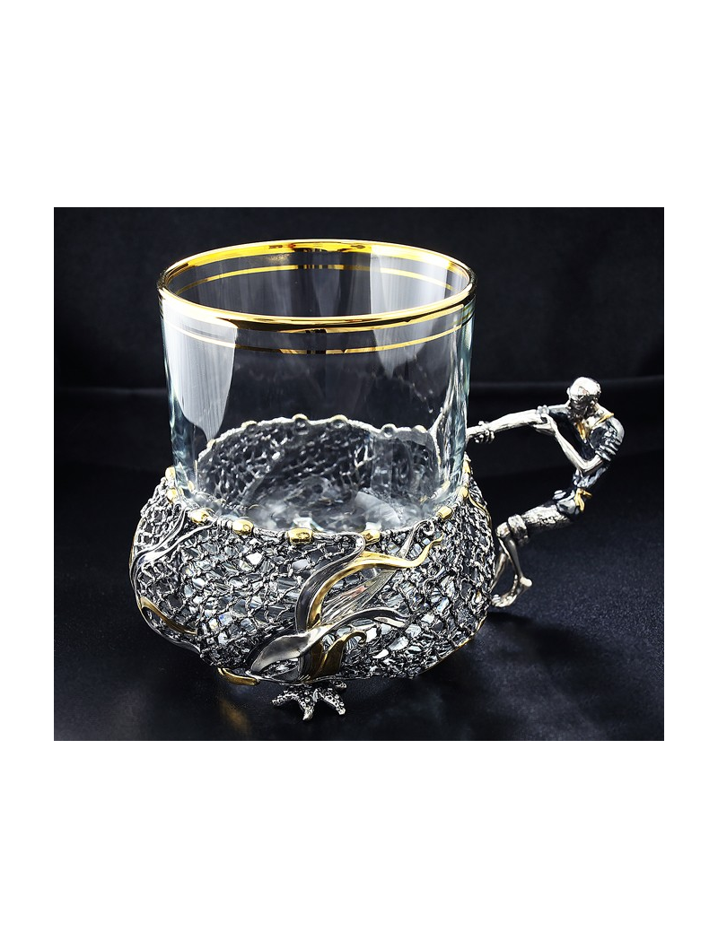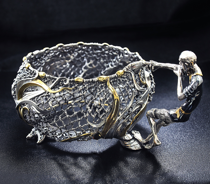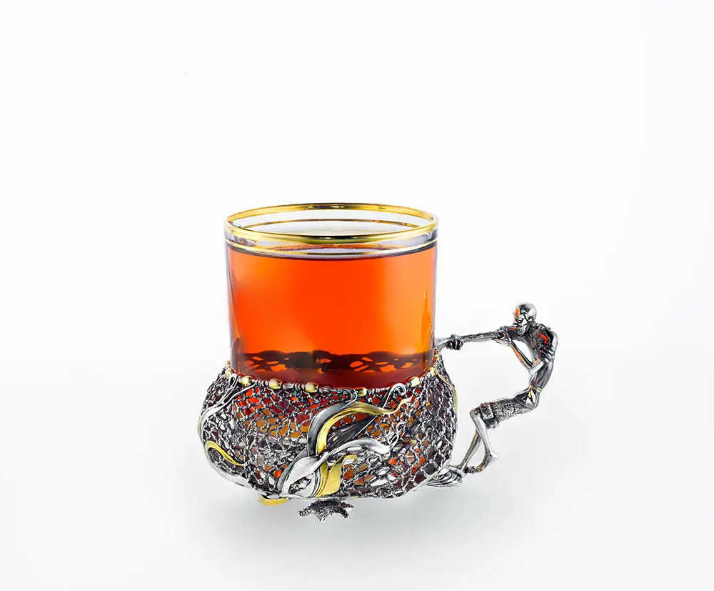 Сеть, оплетенная водорослями – основная часть подстаканника, гармонично сочетается с ручкой, выполненной в виде старика, тянущего свой невод. Легкость и реалистичность невода удивительно гармонирует со сказочным, порой юмористичным, образом старика. Его фигура кажется изможденной долгими трудами, но лицо застыло с неподдельным изумлением от необычного улова.