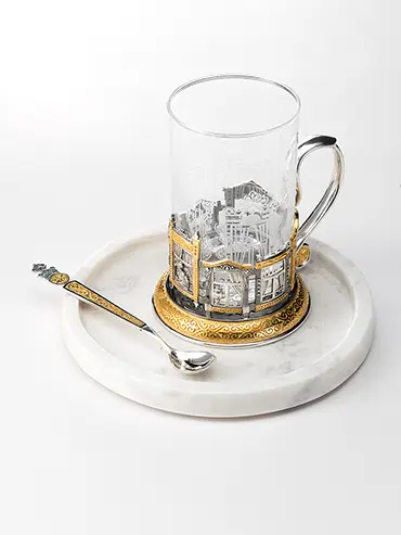 Коллекционный подстаканник посвящен красоте и разнообразию деревянных оконных наличников. Резные шедевры в русских домах всегда были не только эстетическим элементом, но и оберегом, который был призван защищать жилище от «дурного глаза».