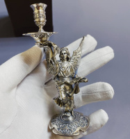 Выполнен в виде ангела, несущего божественный свет, что символизирует стойкость человеческой души, ее внутреннюю силу. Как ни поворачивай свечу, язычок пламени всегда устремлен к небу.