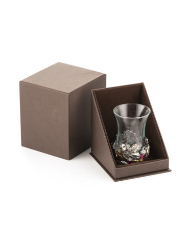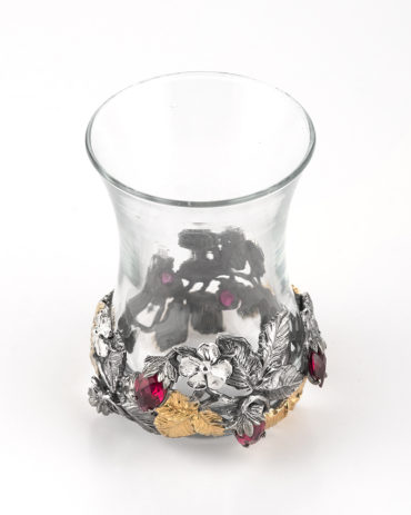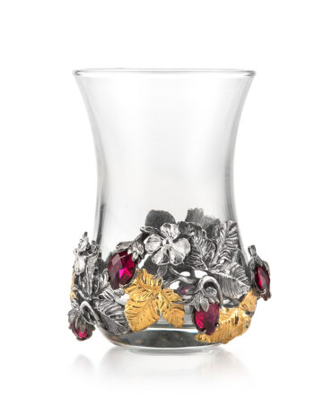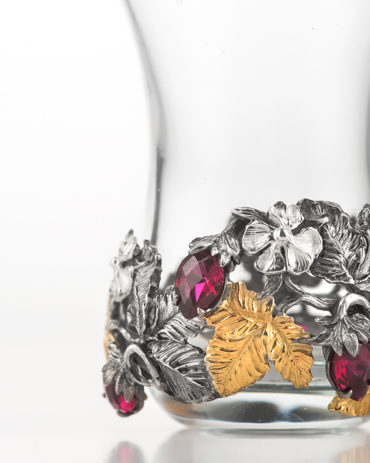 Армуд из термостекла вручную обрамлен стерлинговым серебром с вставками из корунд-рубинов изящной огранки. Произведение займет достойное место в коллекции серебра или станет прекрасным подарком для ценителей ювелирного искусства.