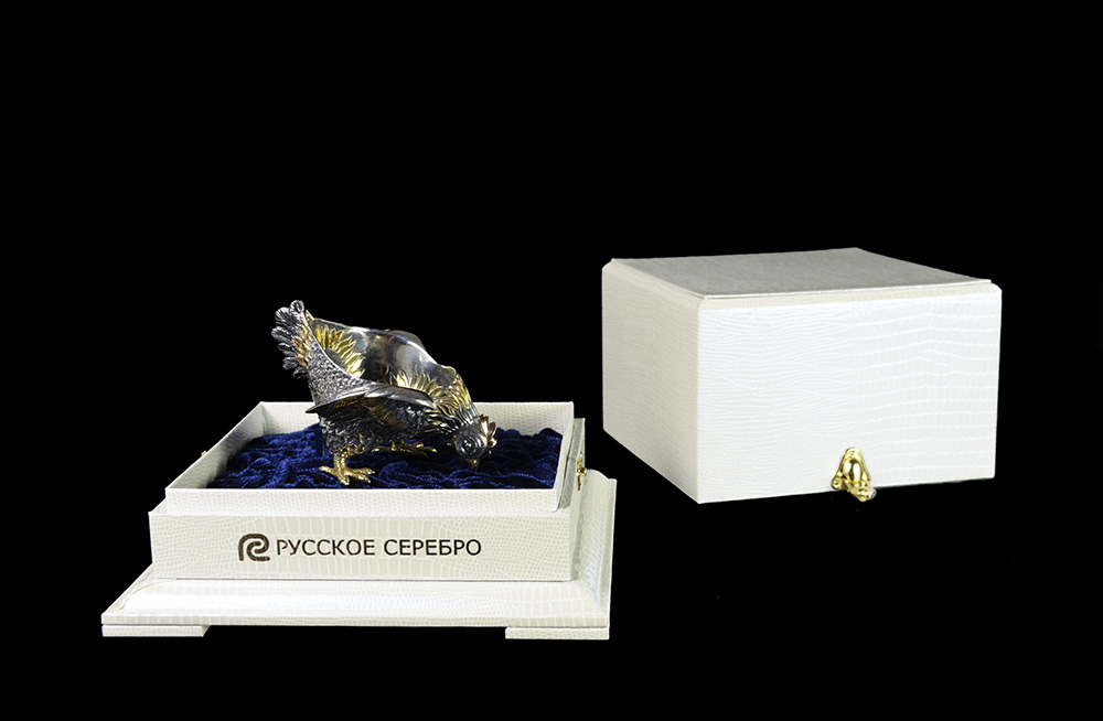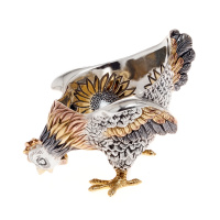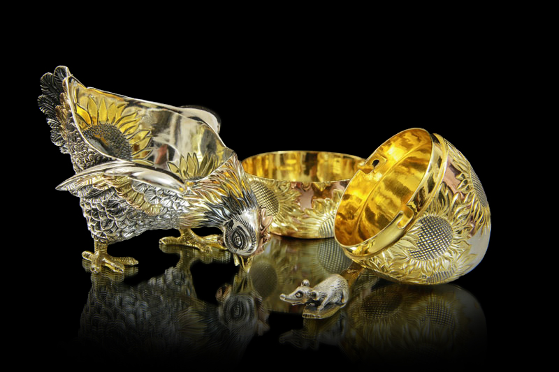 Предмет представлен в виде курочки, которая ищет пшено. Основная часть изделия покрыта позолотой и узорами в виде солнечных цветов - подсолнухов. Композиция заняла высокие почетные места в международных конкурсах, что подтверждается паспортом изделия особенно высокого мастерства. Станет примечательным подарком на любое празднование.
