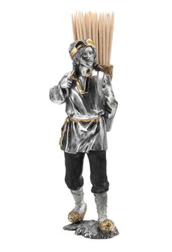 Эксклюзивная подставка для деревянных зубочисток, сделанная полностью вручную в стиле “старых” мастеров московской ювелирной школы. Фигура крестьянина детально проработана, элементы костюма позолочены. Подставка великолепно сочетается с набором для специй «Крестьянка». Изделие утилитарно, и не будет стоять без дела.