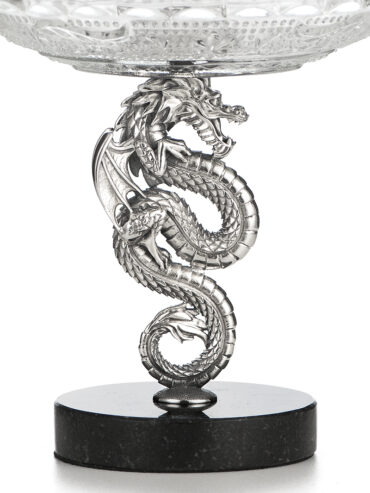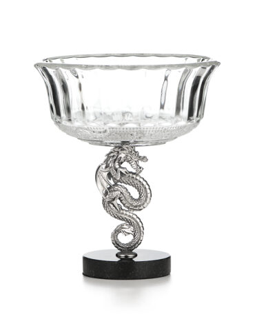 Новогодняя вазочка, в честь 2024 года, сделана полностью вручную. Стержень блюда изготовлен в форме восточного дракона из серебра. Основание вазы выполнено из мрамора. Серебряная закрутка стеклянного блюда украшена китайским иероглифом «счастье». Фирменный подарочный футляр в комплекте.
