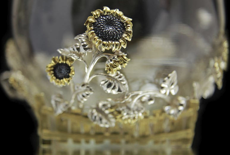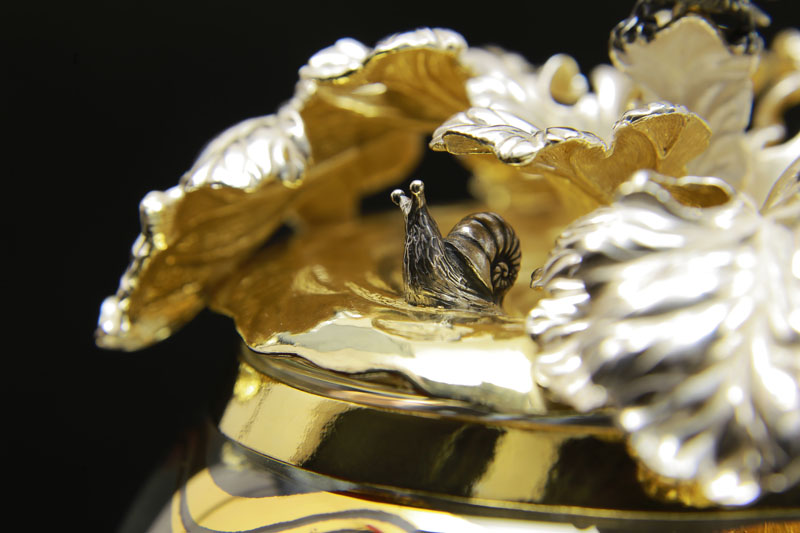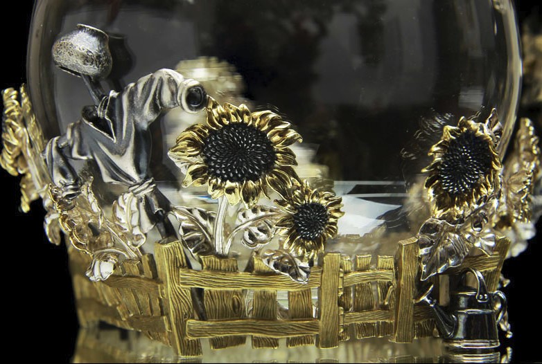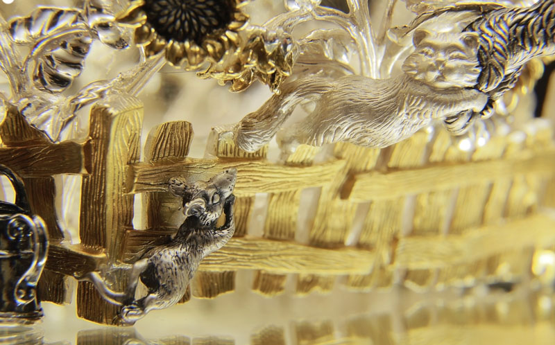 Чайник «Репка» представлен в виде сложной многофигурной композиции. Подставкой служит огороженный забором деревенский участок земли, по периметру которого ввысь устремляются позолоченные подсолнухи – большие и набухшие от созревших семечек. Своим видом они символизируют благодатный и щедрый август. А рядышком стоит крестьянская лейка, без которой ни один урожай не вырастишь. Этот небольшой элемент наполняет всю композицию необычайным уютом, какой-то особенной домовитостью. Ну а вся родня и живность уместились на оригинальной ручке. И все они устремляются к объёмной ботве на верхушке, образующей крышку и свисающей, будто листья лопуха. Того и гляди – сорвётся и полетит вниз, как настоящий.