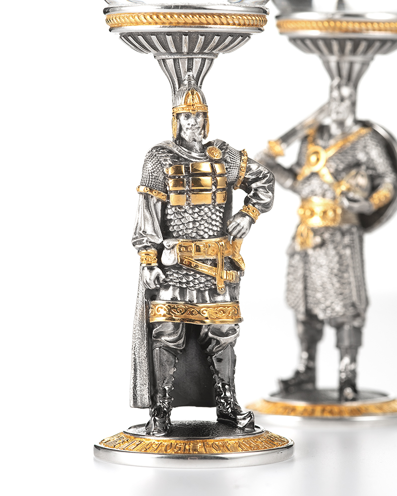 Набор позолоченных рюмок, объемом 25 мл., выполнен из серебра с хрусталем, полностью вручную. Питейное изделие «тет-а-тет» посвящено русскому воинству. В основании сосудов расположены пословицы. У витязя с мечом в ножнах — «Кто храбр, да стоек, тот десятерых стоит». «Тот герой, кто за Родину горой» — у богатыря с оружием на плече.