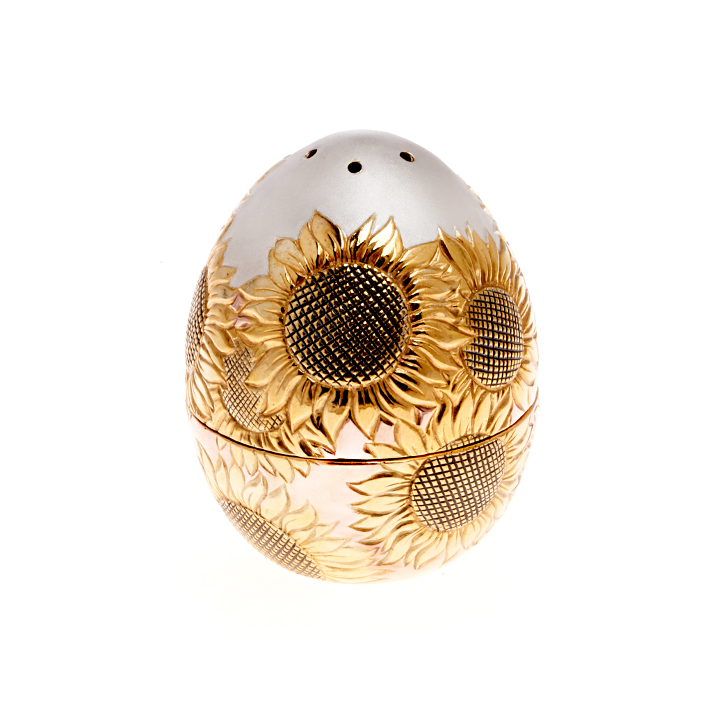 Изделие выполнено из серебра 925 пробы, тончайшим образом покрыто позолоченным узором в виде подсолнухов.