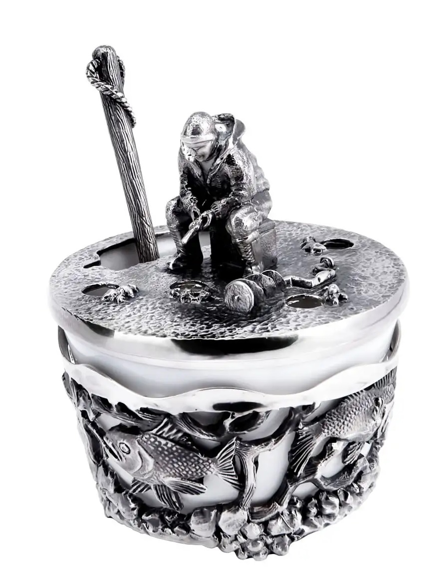 Солонка "Рыбак" с чернением - великолепный подарок и настоящее украшение стола. Солонка выполнена из фарфора высокого качества, а представленная подставка - из серебра 925 пробы, поверхность крышки украшена серебряной фигуркой рыбака и чернением. В комплекте также представлена серебряная ложечка для соли. Набор упакован в тёмно-синий футляр.