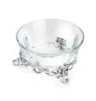 В коллекции представлены разные исполнения: икорница с крышкой для сохранения свежести, изысканная икорница ракушка, декоративная икорница рыбки, модели с орнаментом «виноградная лоза», а также варианты с черненое или позолоченное акцентирование элементов. Встречаются решения с хрустальной чашей и даже посеребренная латунь — подробности смотрите в описание каждого товара.