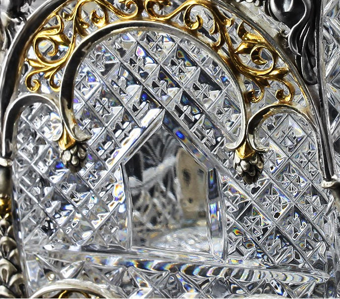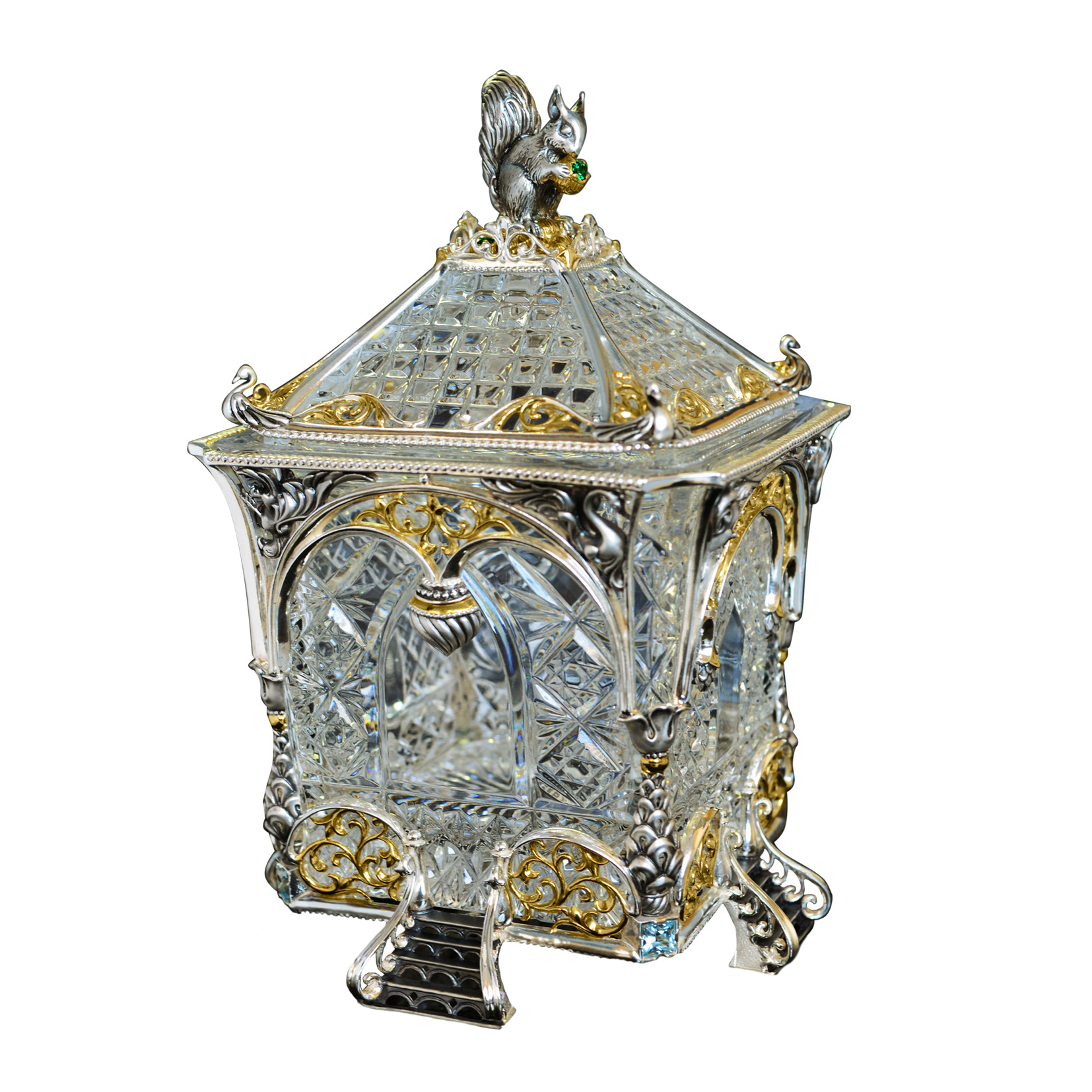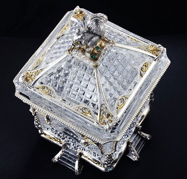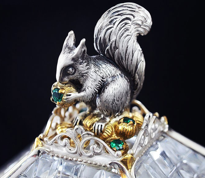 Хрустальная основа сахарницы "Белочка" обрамлена изящным серебром. Резной орнамент архитектуры тех времен был не просто украшением — он нес в себе особый смысл. Наш домик не исключение — в исконно русских традициях здесь изображены сюжеты сказки, символизирующие борьбу добра со злом. Строгие архитектурные элементы оживляются золоченым растительным орнаментом, что создает гармоничный ансамбль творений природы и человека. В центре внимания, конечно же, главный персонаж сюжета — Белочка. Она с большой ловкостью разгрызает свои золотые орешки, вынимая при этом драгоценные изумруды.