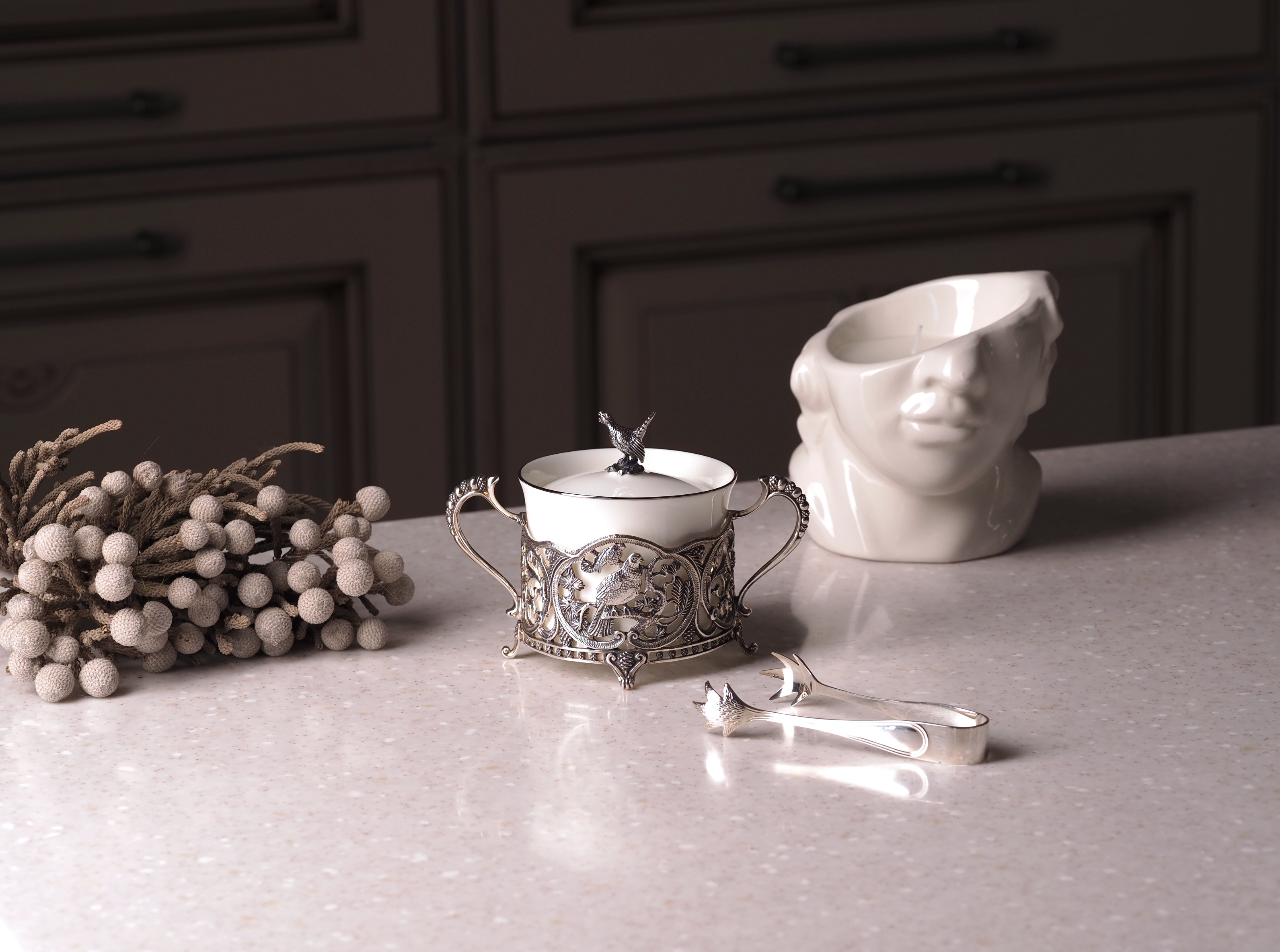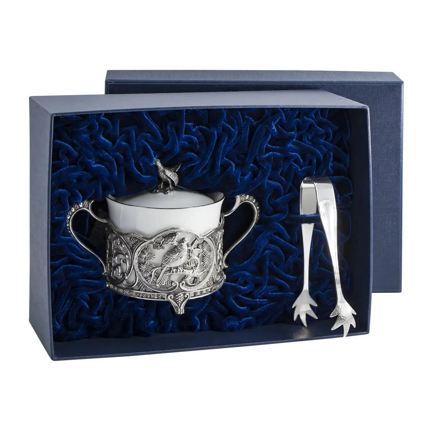 Сахарница "Глухариный Край" может стать украшением чайного стола. Ёмкость, выполненная из качественного фарфора, вставлена в оплётку из серебра 925 пробы с чернением. Ручки и подставка украшены стильными витыми узорами глухарей и охотника с собакой. В футляре также находятся щипцы для захвата кубиков сахара.
