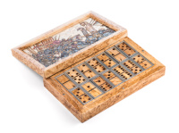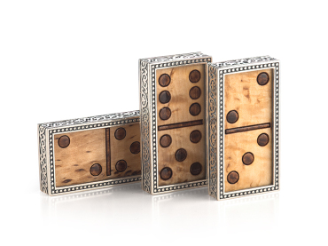 Ларец для домино и внутренняя часть костяшек выполнены из массива карельской березы.