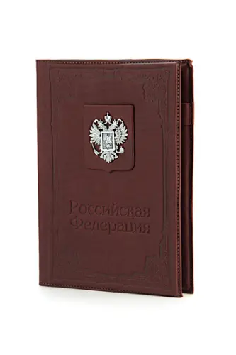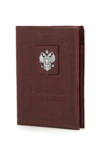 Большой ежедневник «Российская Федерация» выполнен вручную из телячьей кожи и украшен серебряным гербом России высокой степени проработки. Съемный блок напечатан на качественной мелованной бумаге и украшен трехсторонним золотым обрезом. Может комплектоваться серебряной ручкой, для которой в обложку вшита петля.