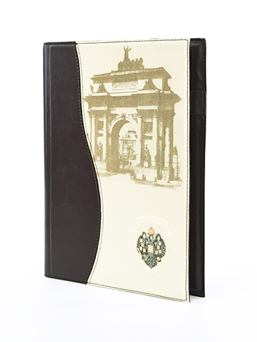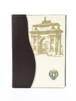 Большой ежедневник формата А5 «Триумф» выполнен вручную из телячьей кожи и украшен серебряным гербом высокой степени проработки. Съемный блок напечатан на качественной мелованной бумаге и украшен трехсторонним золотым обрезом. Может комплектоваться серебряной ручкой, для которой в обложку вшита петля.