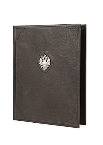 Выполнен вручную из телячьей кожи и украшен серебряным гербом царской России.