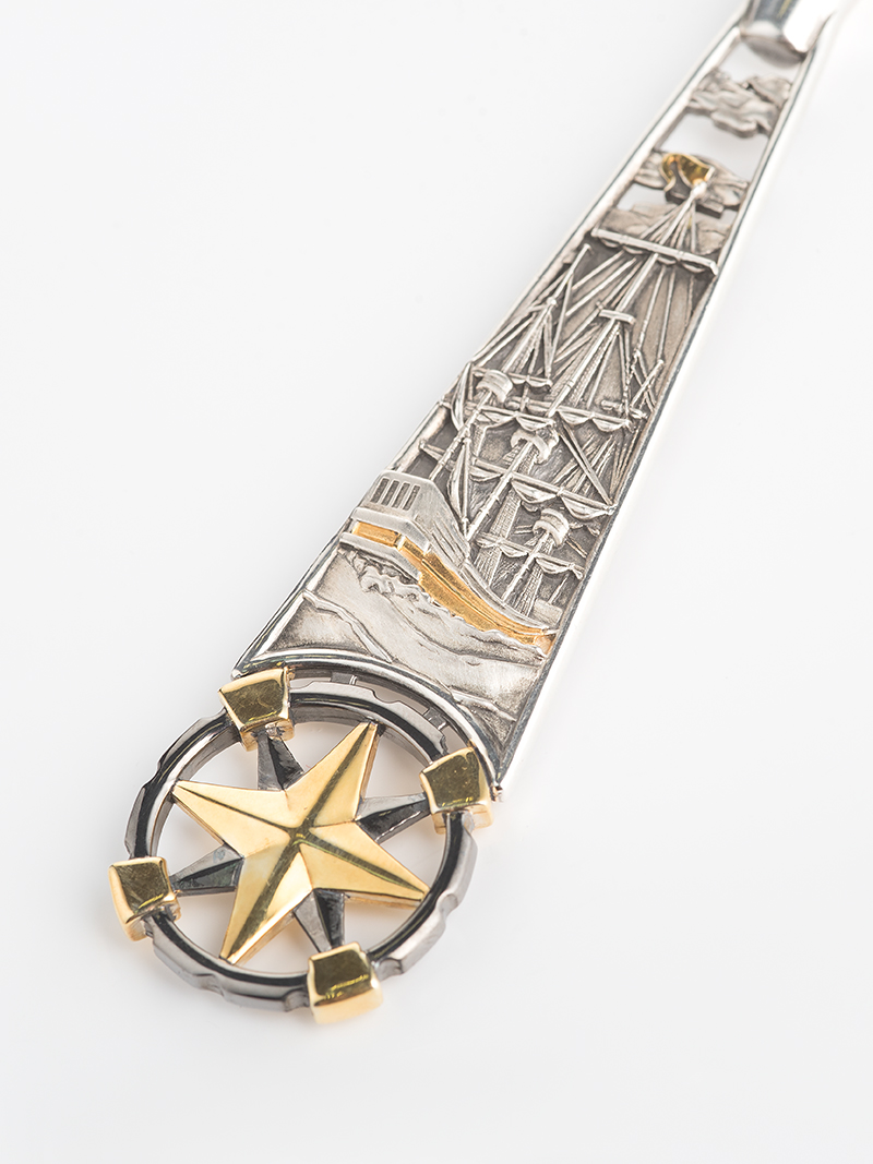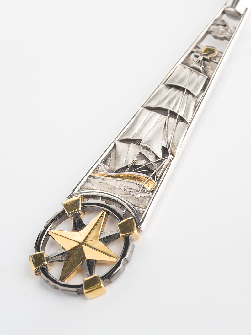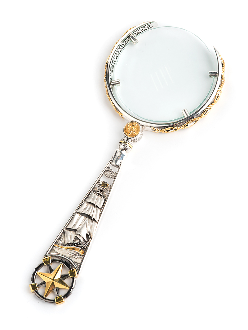 Ручная просмотровая лупа с 4,5-кратным увеличением изготовлена из серебра вручную. Диаметр рабочего поля стеклянной линзы — 60 мм. Увеличительное стекло предназначено для людей с ослабленным зрением, позволяет рассмотреть штрихкоды, мелкие рисунки, тексты, схемы и карты.