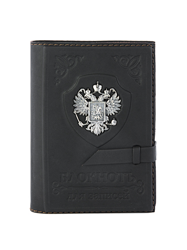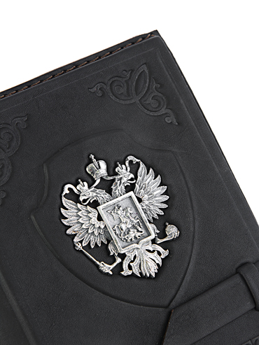 Блокнот «Держава» выполнен вручную из телячьей кожи. Украшен серебряным гербом России высокой степени проработки.