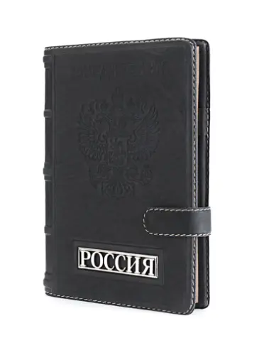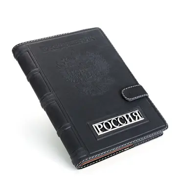 Большой ежедневник формата А5 представительского класса «Россия» выполнен вручную из телячьей кожи и украшен серебряной плакеткой высокой степени проработки. Съемный блок напечатан на качественной мелованной бумаге и украшен трехсторонним золотым обрезом. Может комплектоваться серебряной ручкой, для которой в обложку вшита петля.