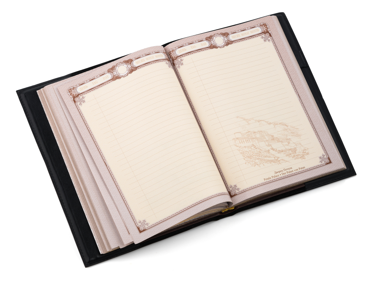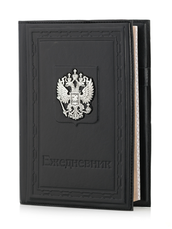 Клейма мастерской и пробирной палаты находятся на центральном элементе композиции ежедневника. Поставляется в подарочном футляре и транспортной коробке.