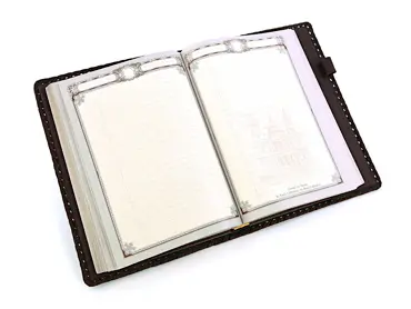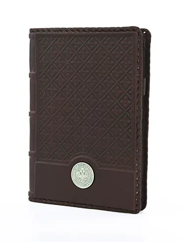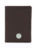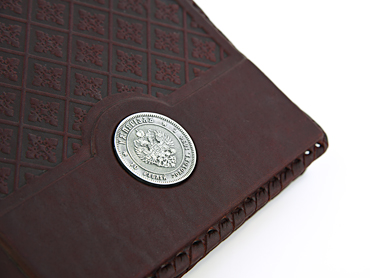 Большой ежедневник формата А5 «Империал» выполнен вручную из телячьей кожи и украшен серебряной плакеткой высокой степени проработки. Съемный блок напечатан на качественной мелованной бумаге и украшен трехсторонним золотым обрезом. Может комплектоваться серебряной ручкой, для которой в обложку вшита петля.
