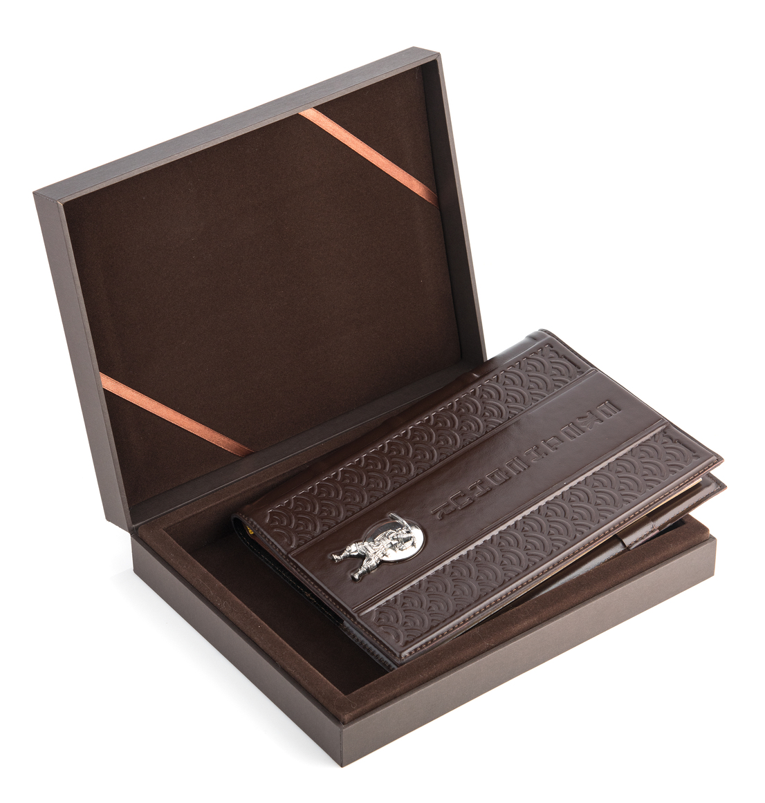 Клейма мастерской и пробирной палаты находятся на центральном элементе композиции ежедневника. Поставляется в подарочном футляре и транспортной коробке.