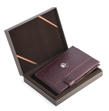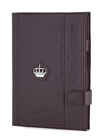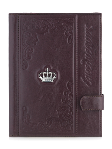 Большой ежедневник формата А5 «Царица» выполнен вручную из телячьей кожи и украшен серебряной плакеткой высокой степени проработки. Съемный блок напечатан на качественной мелованной бумаге и украшен трехсторонним золотым обрезом. Может комплектоваться серебряной ручкой, для которой в обложку вшита петля.