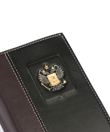 Обложка для документов «Родина» выполнена вручную из телячьей кожи и украшена серебряной плакеткой высокой степени проработки.
