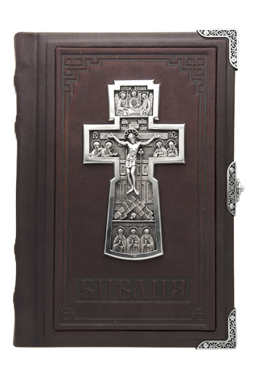 Библия «Троица» украшена серебряным крестом в стиле XV-XVII вв. Центральный элемент креста — распятие с четырьмя предстоящими на фоне Иерусалимской стены. Предстоящие: Богоматерь, Святая Мария, апостол Иоанн Богослов и мученик Лонгин сотник. Над распятием — Святая Троица. Внизу — Три Святителя: Григорий Богослов, Василий Великий и Иоанн Златоуст.