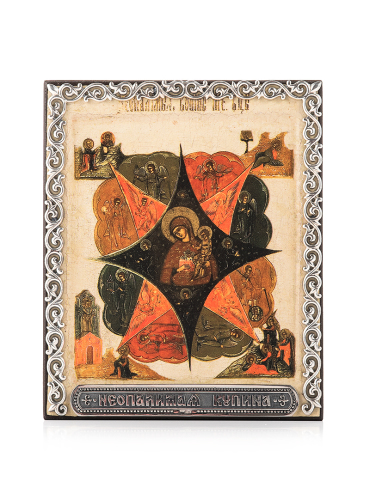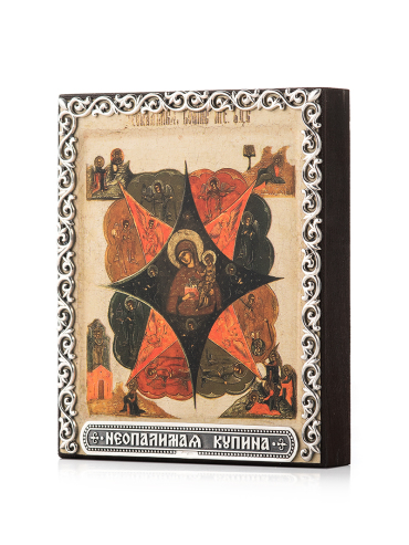 Изображение на иконной доске из липы нанесено прямой печатью по левкасу и покрыто лаком. Нимбы позолочены сусальным золотом. Применен эффект старения — трещинки, патина.