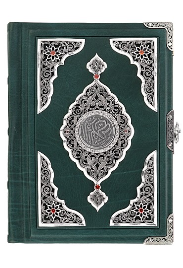 Оригинальное издание Священного Корана на арабском языке выполнено в окладе из слиткового серебра. Переплет из тонкой телячьей кожи глубокого зеленого цвета вручную инкрустирован объемными серебряными вставками и расписан в технике горячей эмали. Цвет кожи выбран не случайно, он выступает как символ райских садов, молодости и изобилия. Лицевую сторону оклада украшает надпись «Священный Коран», которая выполнена арабской вязью и помещена в розетку небесно-голубого цвета. Все элементы инкрустации богато украшены растительным орнаментом — ислими. Выбор подобного оформления продиктован исламской традицией – передавать красоту форм через каллиграфию печатного слова и использование растительных орнаментов в декоре, не изображая при этом одушевленных предметов. Смысл использования бесконечно переплетающихся узоров, лежит в абстрактном видении явлений в исламе, и призван направить человека к пониманию бесконечного в конечных формах. Оклад дополнен серебряными уголками и фигурной застежкой