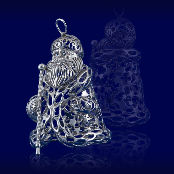 Елочная игрушка из серебра «Дед Мороз» с фианитами станет прекрасным решением для дорого эксклюзивного презента ручной работы близким или коллегам. Елочная игрушка отличается необычным дизайном – это объемная фигурка символа Нового года Деда Мороза с посохом в ажурной шубе, глаза которого выполнены в виде голубых фианитов классической огранки.