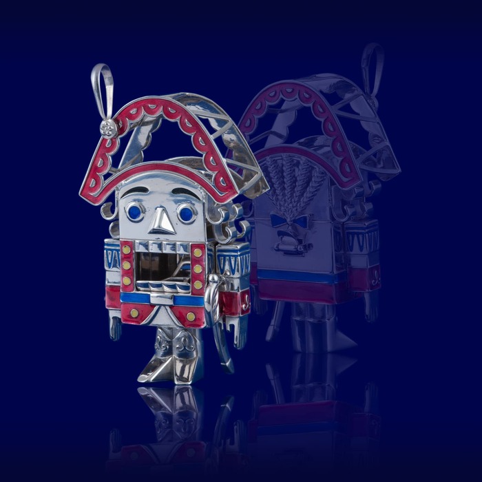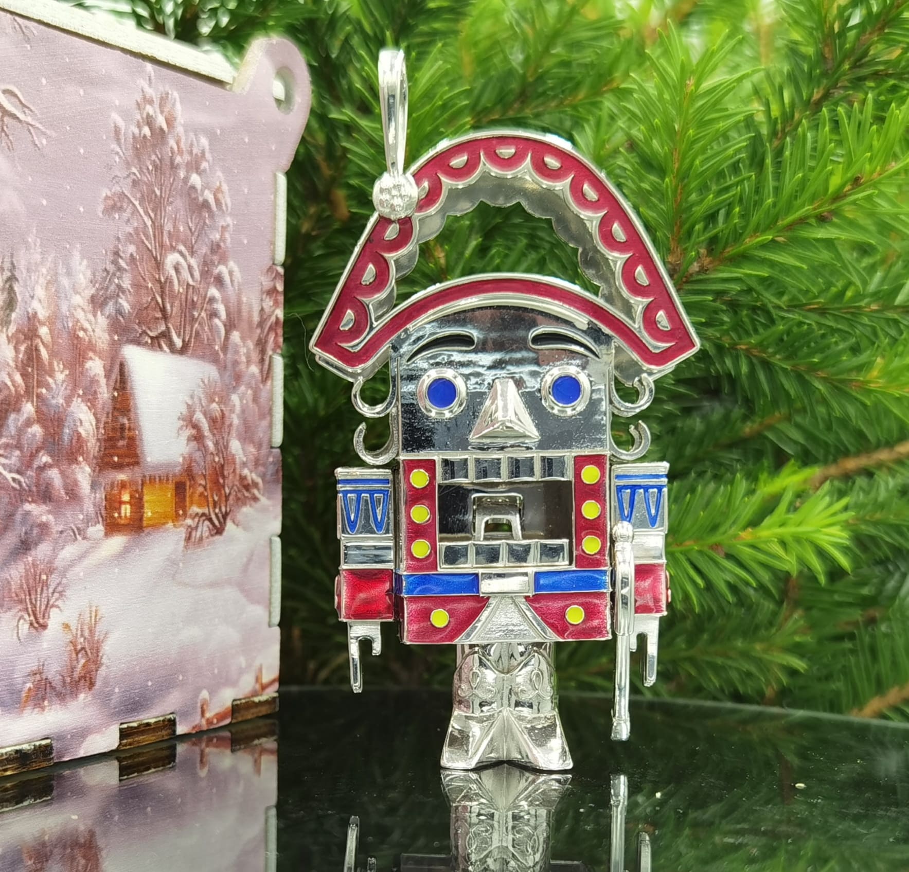 Для изготовления елочной игрушки используется серебро высокой пробы, мягко мерцающее в свете праздничной иллюминации. Это объемная фигурка Щелкунчика, украшенная со всех сторон вставками из эмали красного, желтого и синего цветов. Такая игрушка станет прекрасным подарком коллегам или близким, став солидным презентом на Новый год или Рождество.