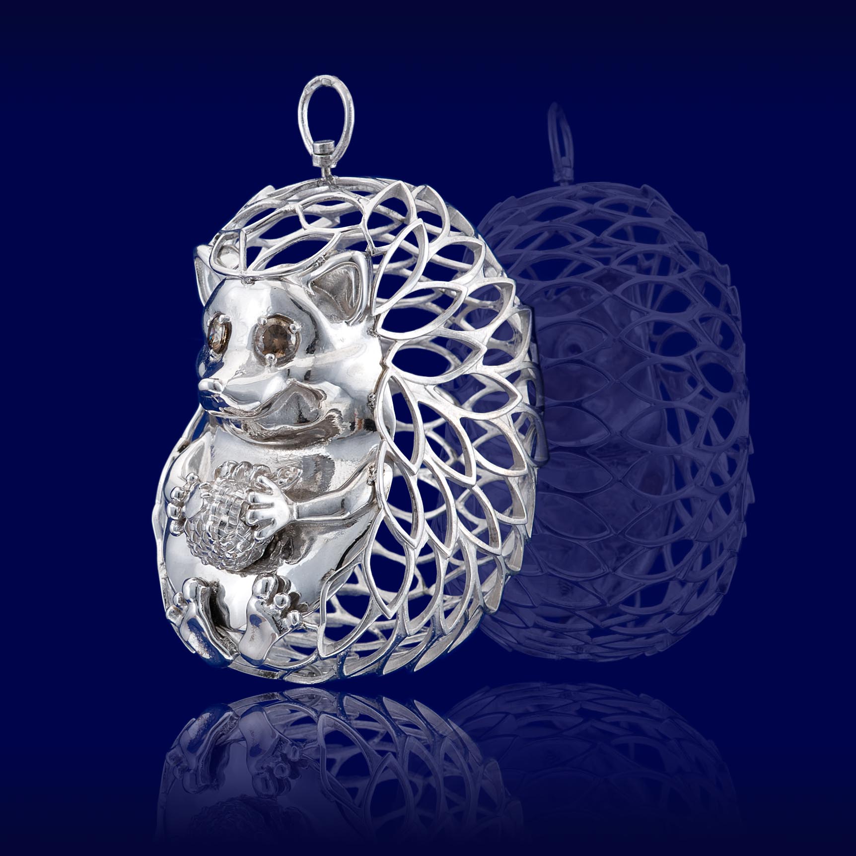 Для изготовления фигурки ежика использовано серебро 925 пробы и вставки из коньячных фианитов классической огранки, мягко переливающихся в свете праздничной иллюминации.