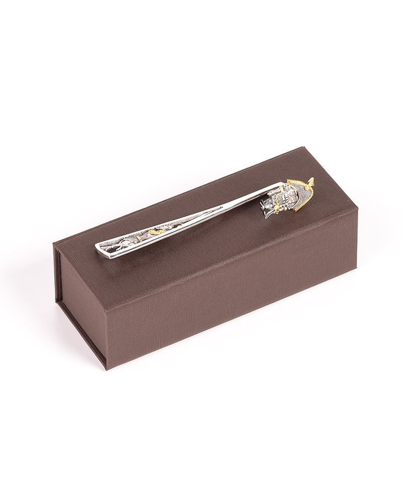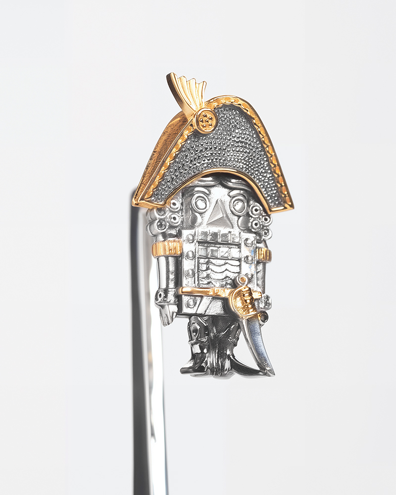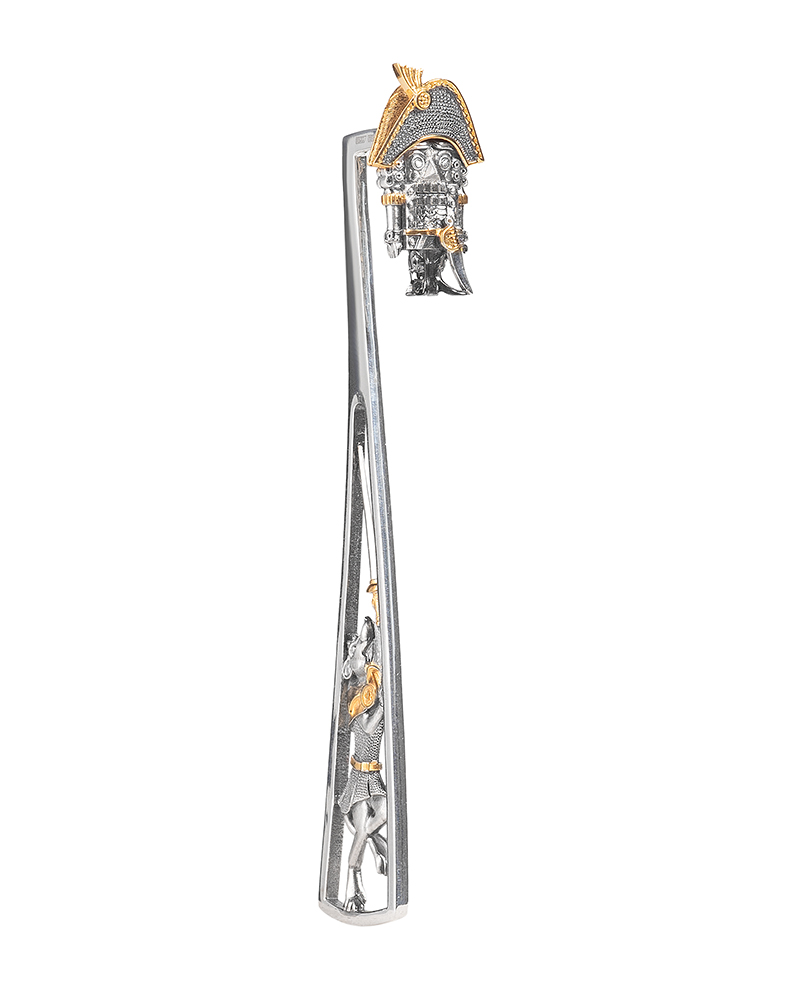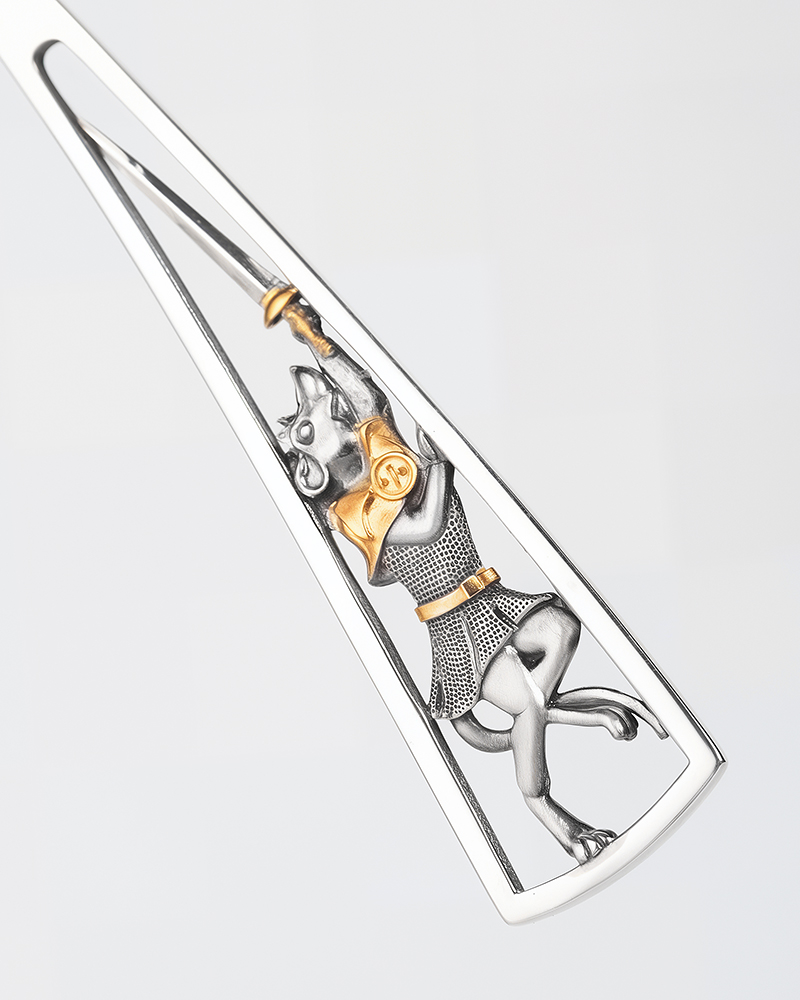 Сказочная закладка выполнена из серебра вручную. Работа посвящена тысячному исполнению балета «Щелкунчик» в Большом театре, и 250-летию со дня рождения Эрнста Теодора Амадея Гофмана. Уроженец Кенигсберга, ныне Калининграда, сделал героями легендарной сказки детей своего товарища Юлиана Гитцига, с которыми он общался и часто играл. Пока Гофман придумывал и рассказывал детям сказки, родился замысел «Щелкунчика». А в октябре-ноябре 1816 года писатель записал и обработал сказку. По сюжету, в рождественский вечер крестный Дроссельмейер дарит Мари и Фрицу подарки. Среди них есть деревянный человечек по имени Щелкунчик. Ночью Мари видит битву оживших игрушек с армией Мышиного короля. Игрушками командует Щелкунчик. Позже она узнает, что Щелкунчик – это заколдованный племянник Дроссельмейера. И Мари помогает его расколдовать. Гофман придал крестному Мари и Фрица много собственных черт, в его образе автор изобразил самого себя. Но сделал Дроссельмейера волшебником — загадочным, добрым и чутким человеком. Главный герой сказки Щелкунчик не просто игрушка – он сделан специально для колки орехов. Такие деревянные фигурки в конце XVIII века в Рудных горах вырезали шахтеры. Городок Зайфен славился резьбой по дереву, и здесь увлекались деревянными игрушками. Щелкунчика делали в виде механической куклы-солдатика, в треуголке и мундире с сабелькой. У него была бородка из кроличьего меха, сзади маленькая косичка, а еще мощная челюсть. В рот вкладывался орех, дергалась косичка, челюсти смыкались и орех раскалывался.